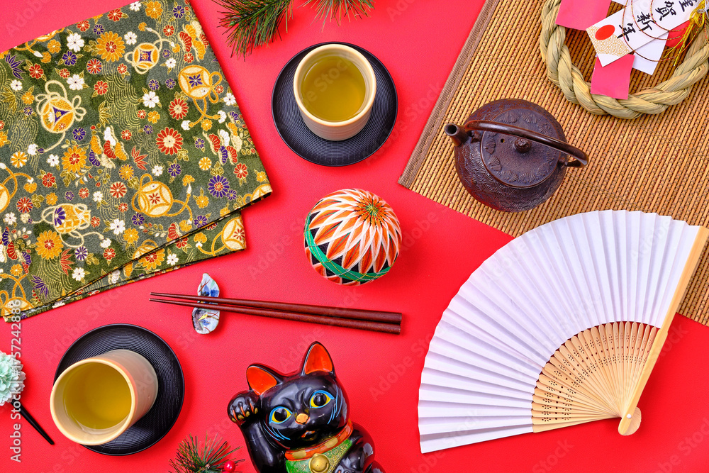 Japanese Traditional Items on Red Background