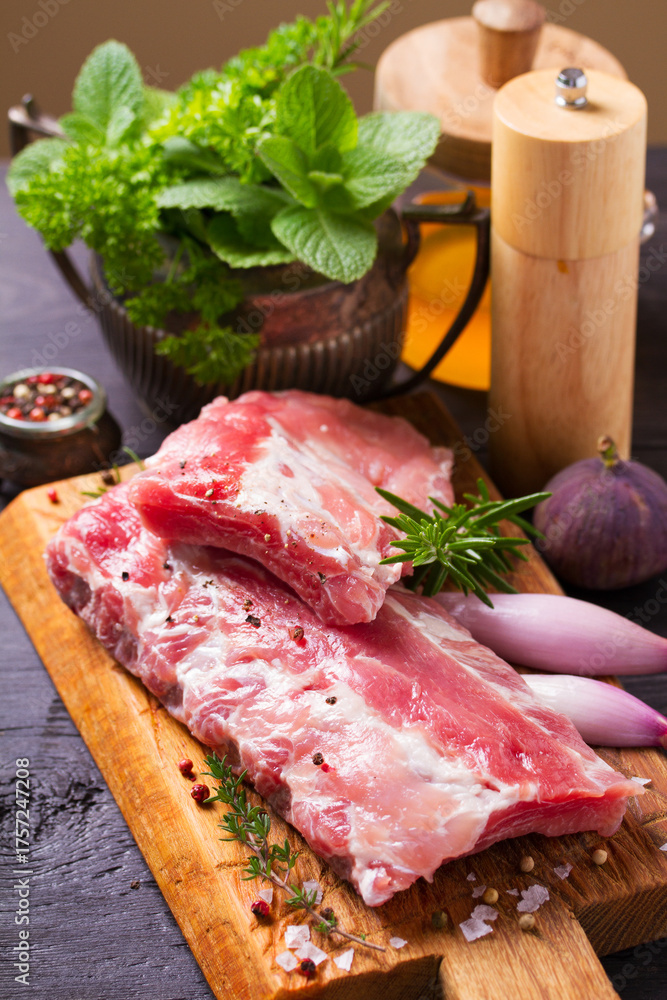 Raw pork ribs with herbs prepared for cooking. Rack of pork ribs