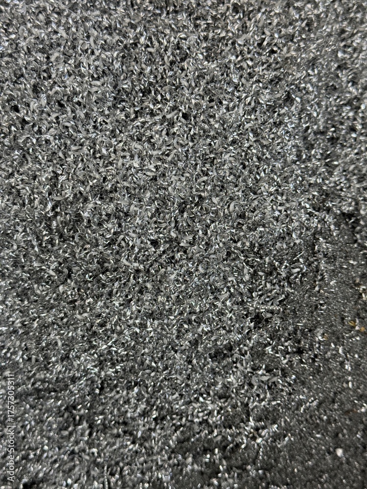 Macro view of machining chips: a dense carpet of glittering metallic curls and fines spread across a dark surface, forming a rough, sparkling texture after aggressive material removal.