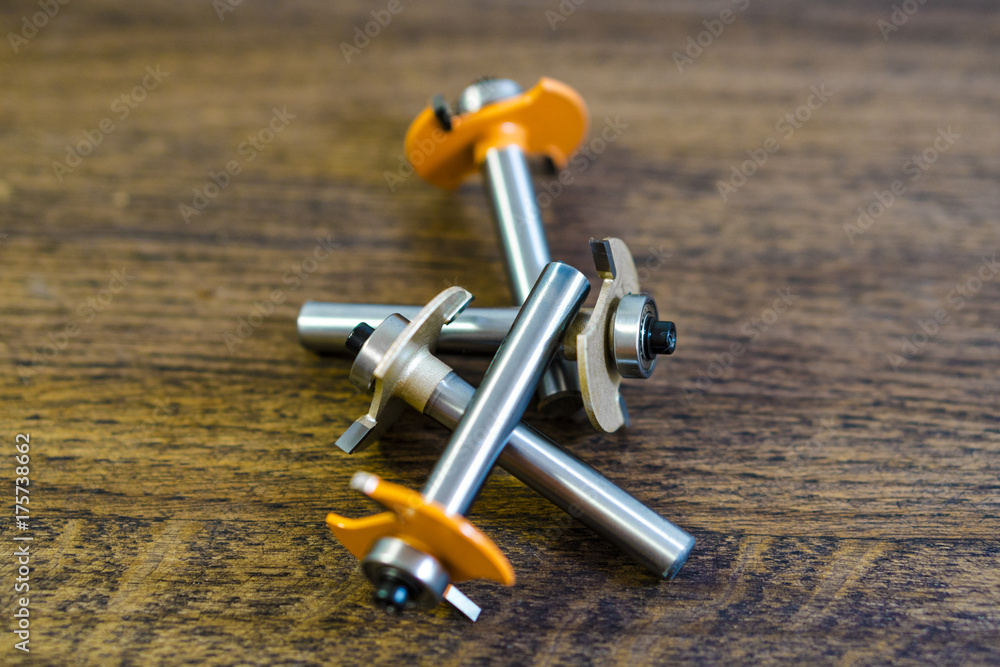 Many scattered mills. Cylindrical cutter with straight teeth. Milling cutter and router bit.