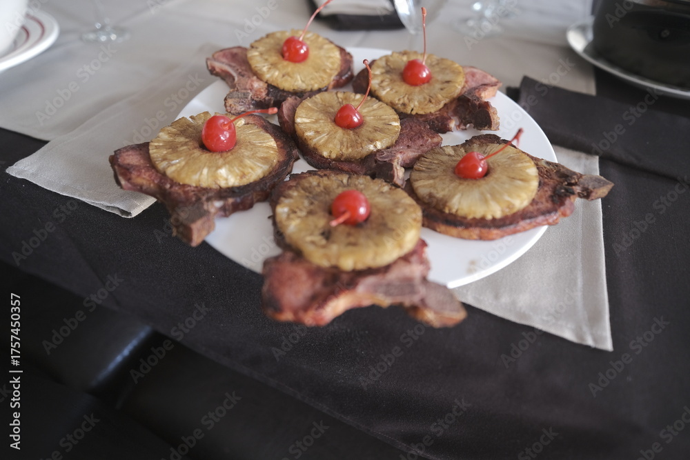a plate of delicious chuleta with pineapple