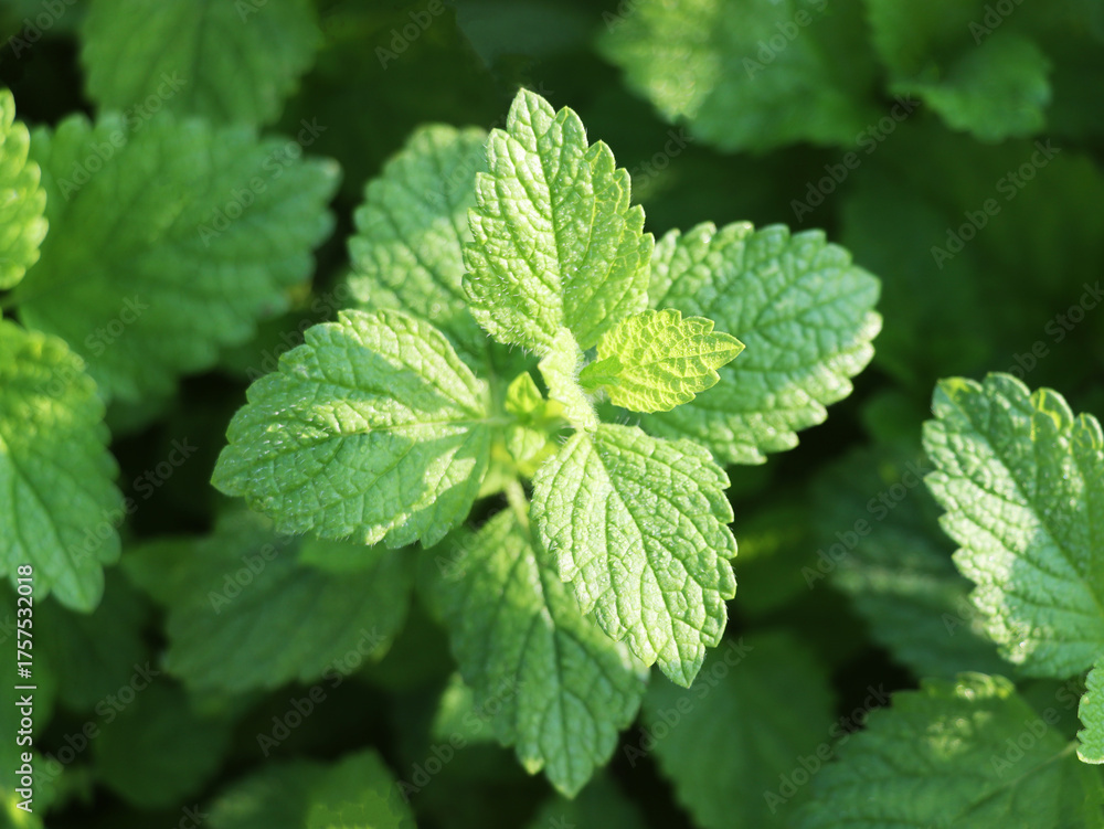 Fresh mint leaves growing in the garden. Green fresh leaves of mint. Mint leaf texture.