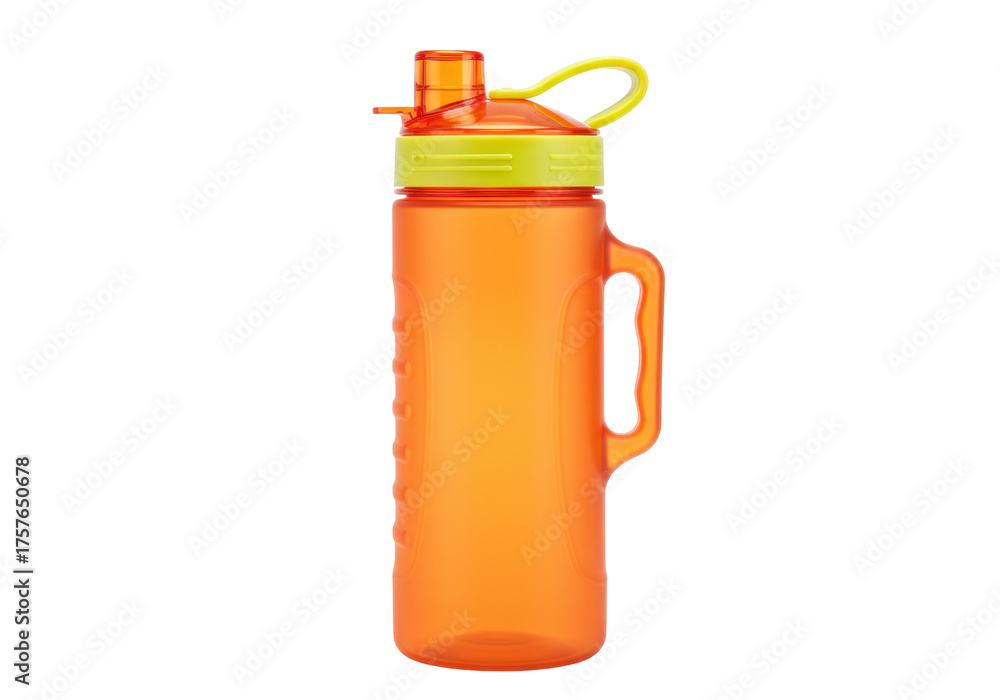 Orange plastic water bottle with green lid isolated PNG, reusable container for sports and fitness on transparent background