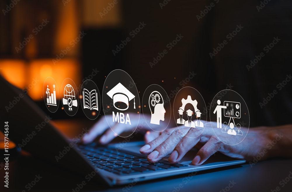MBA Program Concept. Master of Business Administration. Businessman using laptop with MBA text and graduation cap icon, educational and professional development symbols representing business learning.