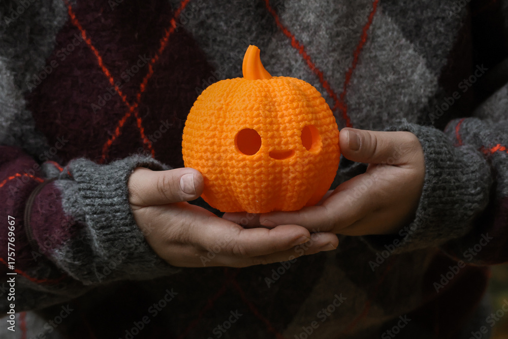 A person holds a cute, orange pumpkin lantern with a smiling face. The pumpkin has a textured surface, and the cozy autumn atmosphere is enhanced by the person’s sweater and the seasonal vibe.