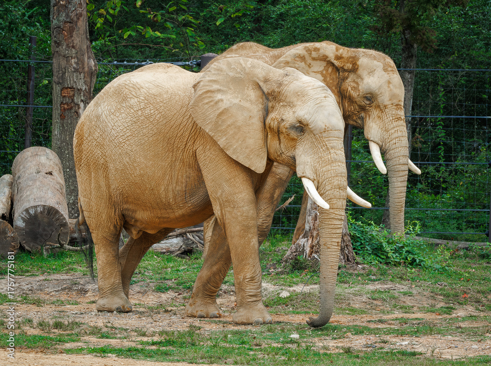 African Elephant browsing at a zoo in Alabama. The African Elephant can live up to 60 years but typically 45 years in the wild. Intelligent mammals who live in large family groups led by a matriarch.
