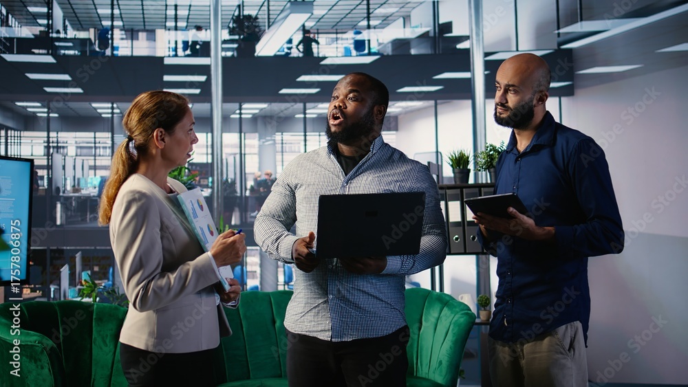 Diverse business leaders sharing their expertise for a new collaboration opportunity, discussing about performance metrics and insights for a success story. Strategic thinking. Camera A.