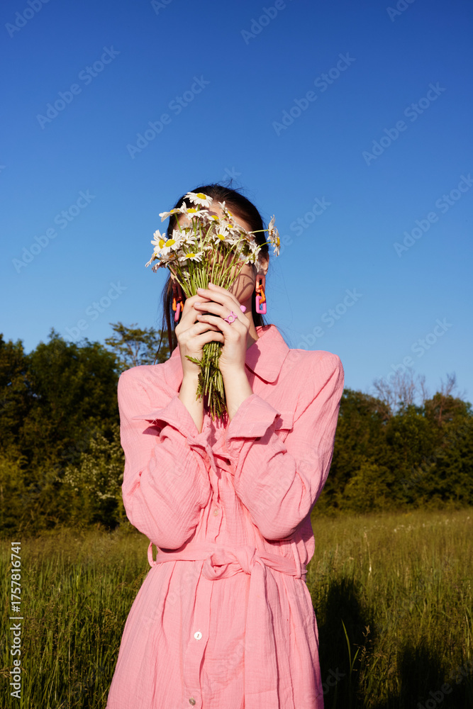 Young woman in a pink dress holding daisies in front of her face, standing in a sunny field, symbolizing joy and connection with nature