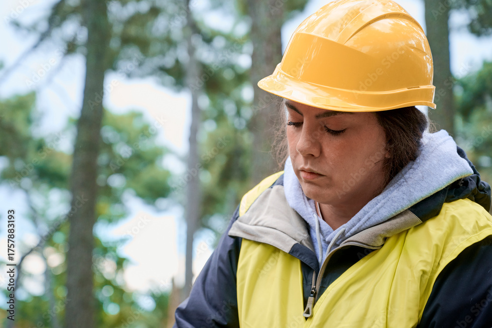 Young brunette woman in work clothes, safety vest, and yellow protective helmet resting after a day of cutting wood in the forest