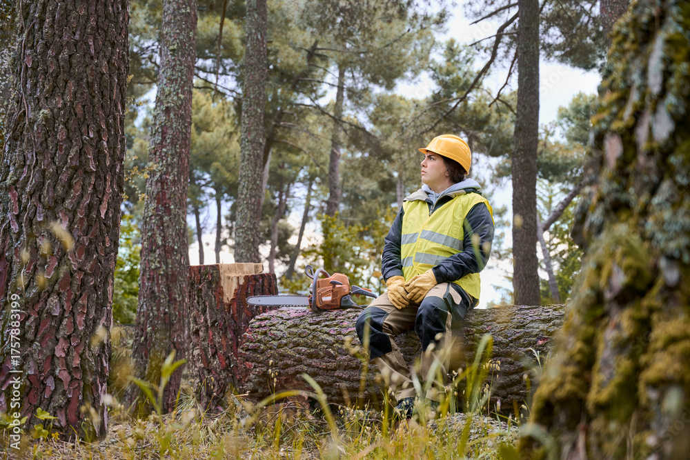 Female lumberjack wearing work clothes and protective helmet rests sitting on a cut tree log in a pine forest next to her chainsaw