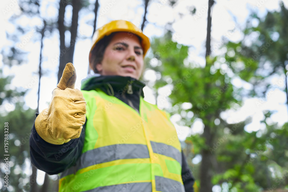 Female worker shows a hand with a raised thumb in a gesture of approval, wearing safety clothing, yellow helmet, and leather gloves