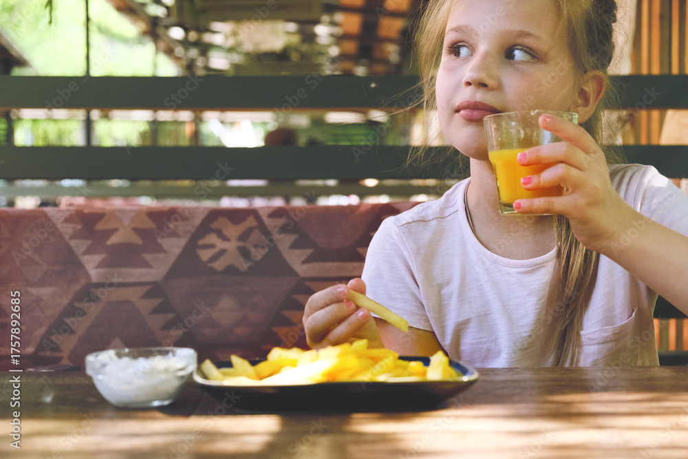 Child eating French fries and sour Cream dip, cheese sause with garlic. Crunchy snack, food. Cafe, fast food restaurant