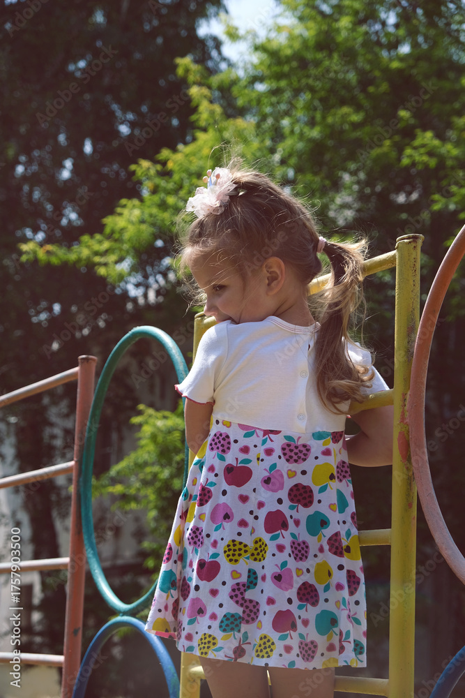 Happy child girl climbing, playing. Active kid on colorful monkey bars. Healthy summer activity for children. Summer time. Life Events. Retro style