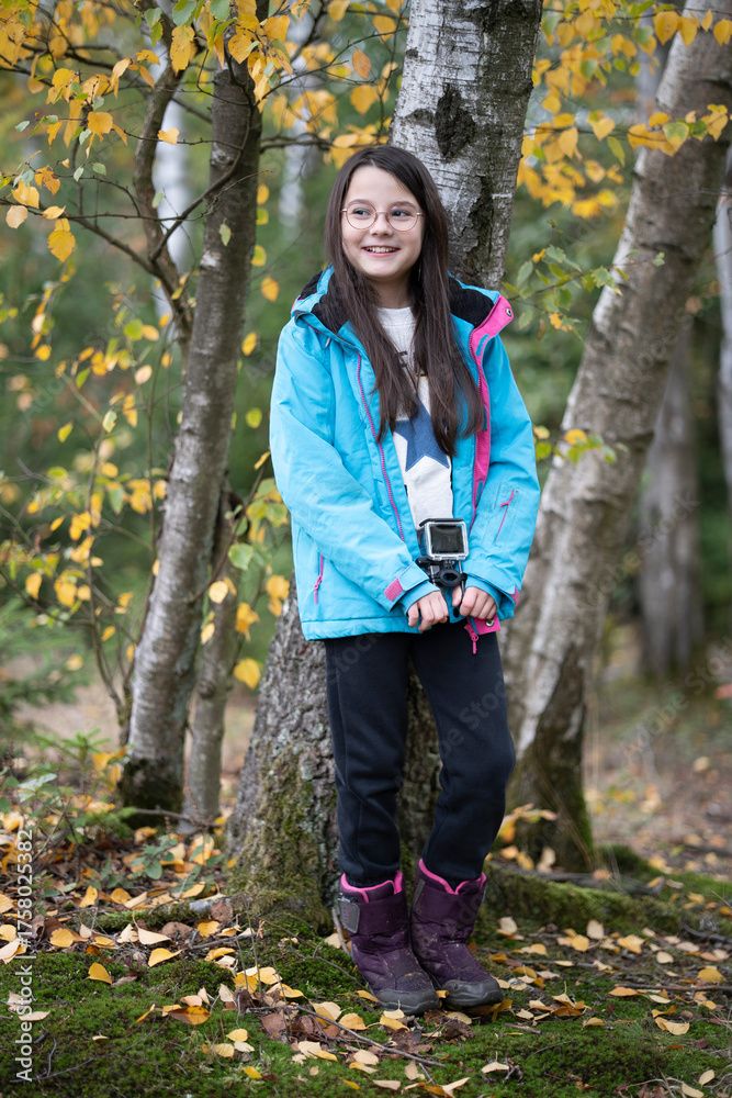 Smiling girl with glasses holding a camera in autumn clothes in the forest, concept of childhood curiosity and photography.