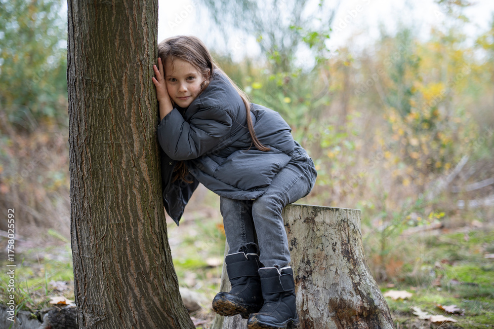 Cute girl in autumn clothes sitting on a tree stump and hugging a tree in the forest, concept of childhood love and connection with nature.