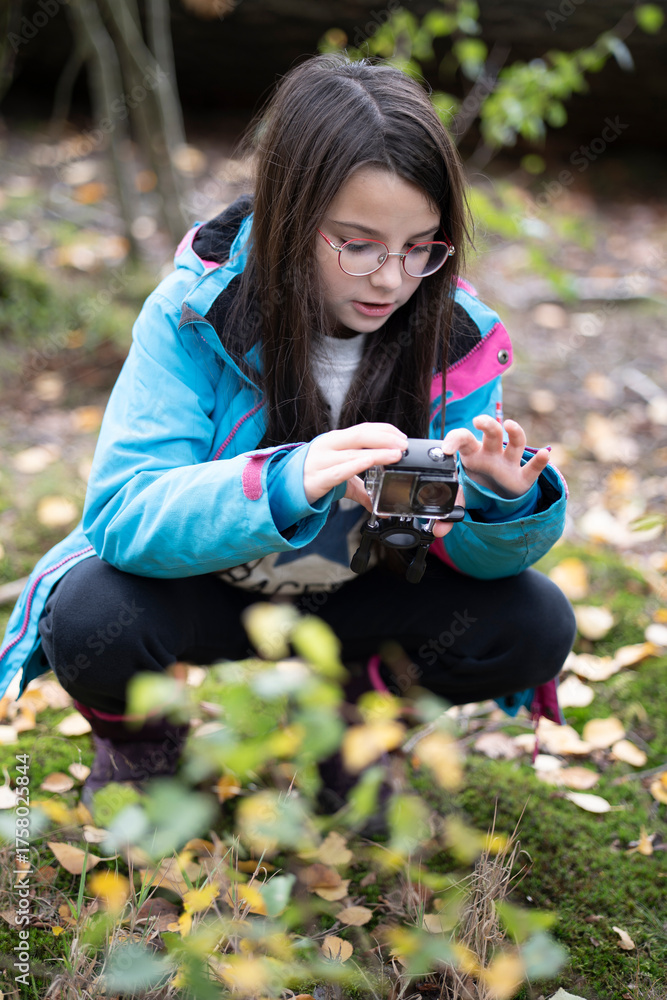 Serious girl with glasses in autumn clothes squatting and photographing a plant in the forest, concept of curiosity and learning nature photography.