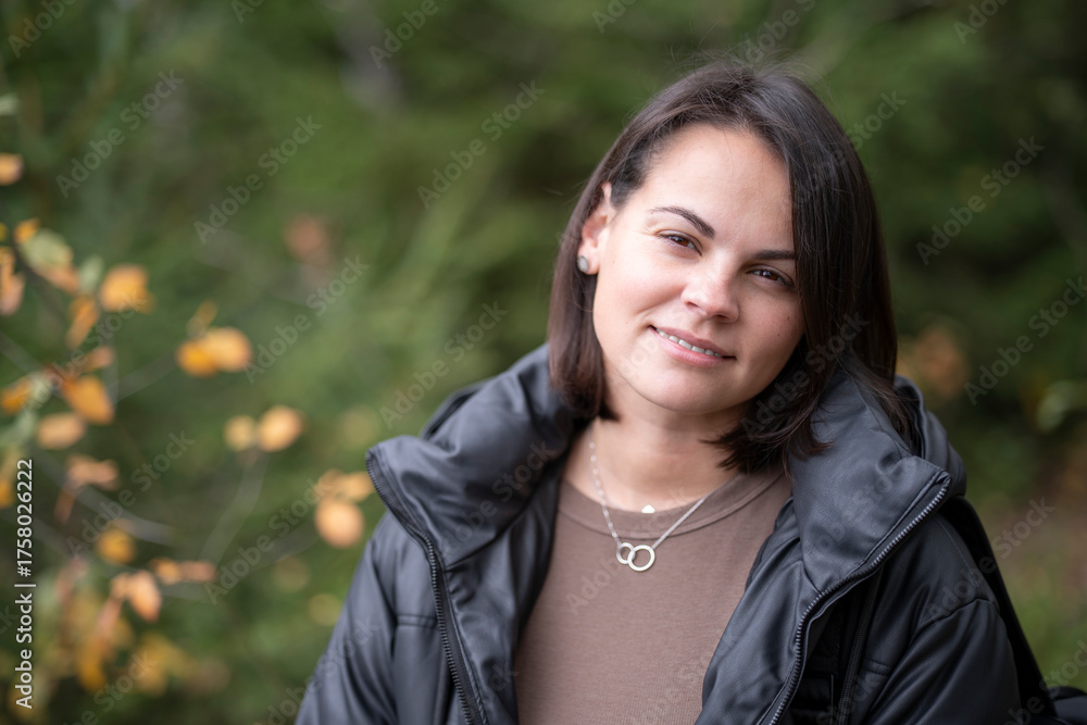 Waist-up portrait of a smiling dark-haired 35-year-old woman outdoors on a blurred natural background, concept of happiness and natural beauty.