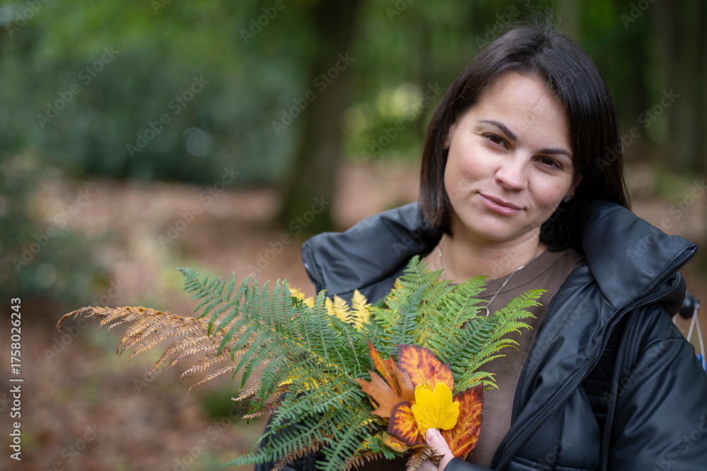 Beautiful dark-haired 35-year-old woman in a black jacket holding a handful of colorful autumn leaves in the forest, concept of harmony and connection with nature.