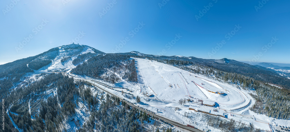 Das Winterportgebiet am Brennes in der Arber-Region im Bayerwald an einem wolkenlosen Wintertag