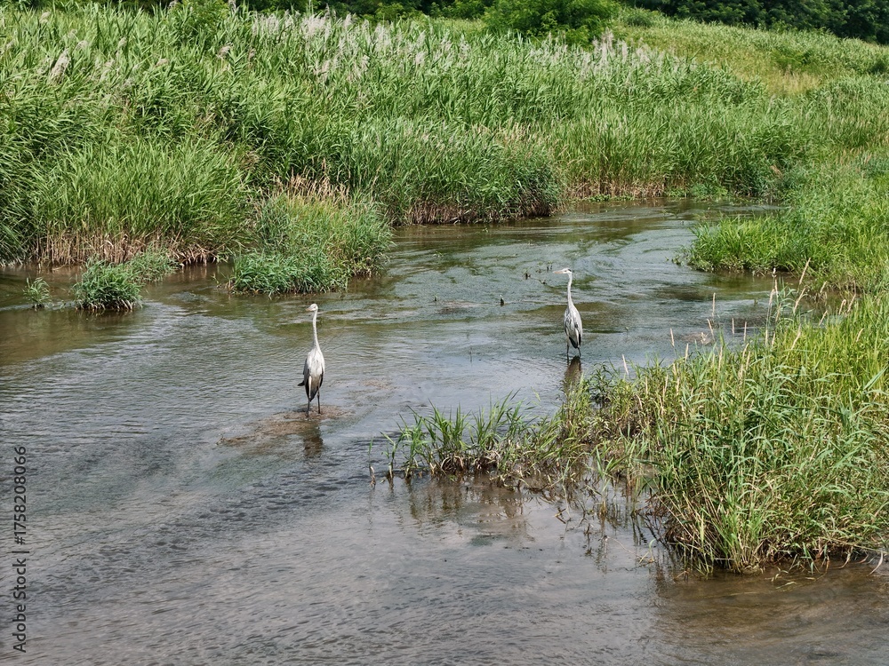 Two birds are walking in a river. The water is murky and the grass is tall. The birds are walking in the water, and the scene is peaceful