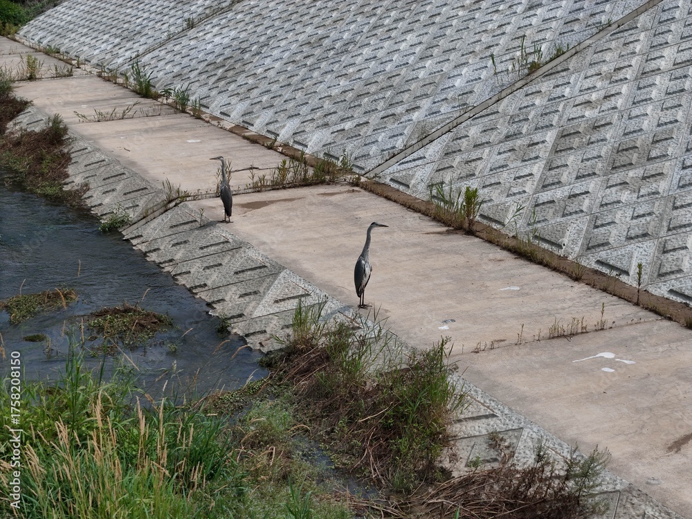 Two birds are walking on a concrete wall next to a body of water. The birds are standing on the edge of the water, and the concrete wall is grey and has a lot of cracks
