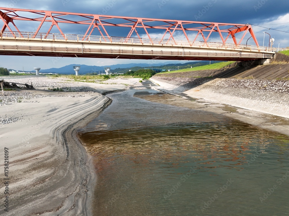 A bridge spans a river with a sandy bank on either side. The bridge is red and spans the entire width of the river
