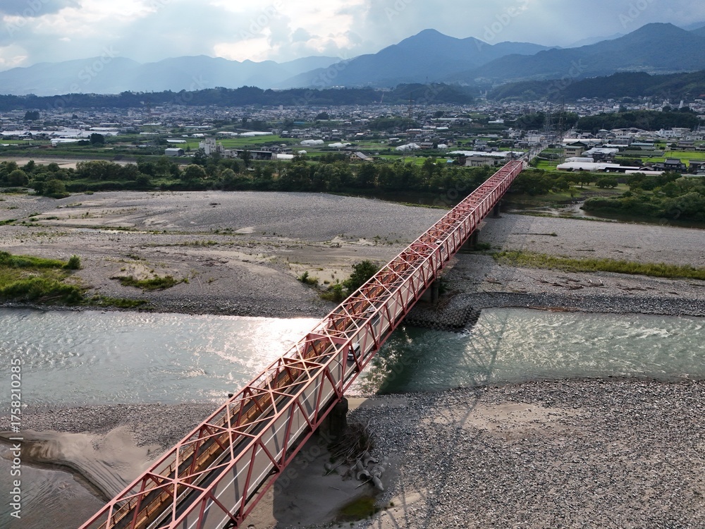A red bridge spans a river with a city in the background. The bridge is a large, red structure that spans the river