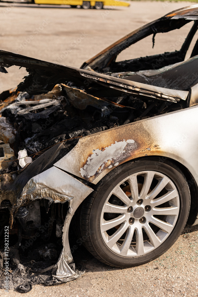 A car with extensive fire damage is parked in a lot. The charred interior reveals the aftermath of a fire, showing melted parts and a ruined exterior finish. The scene depicts urban decay