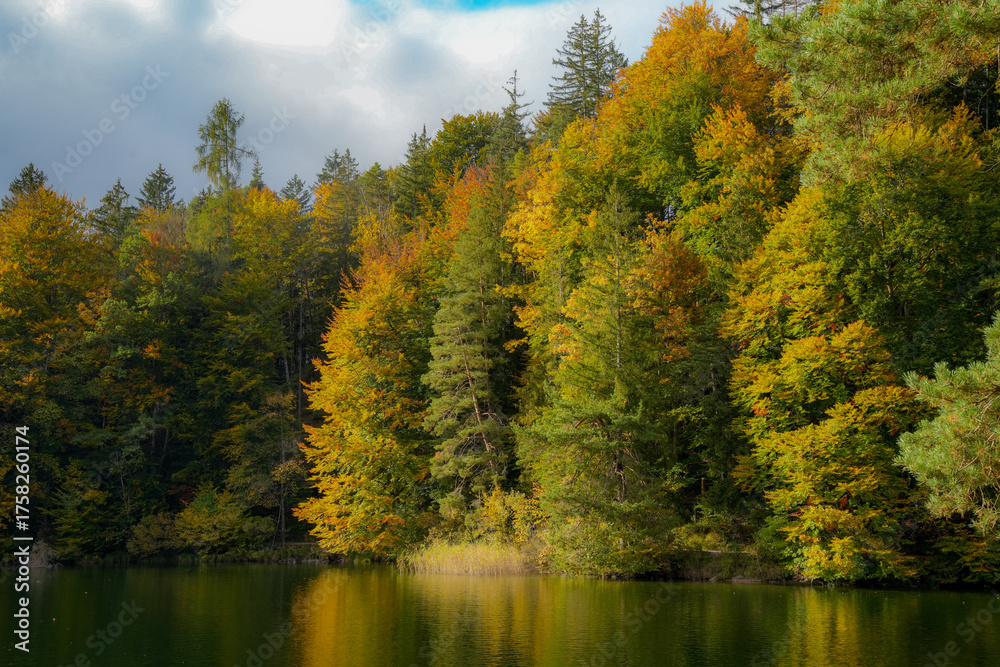 Autumnal atmosphere and colorful trees at Lake Hechtsee, a popular swimming lake in the Brandenberg Alps near Kufstein in Tyrol, Austria