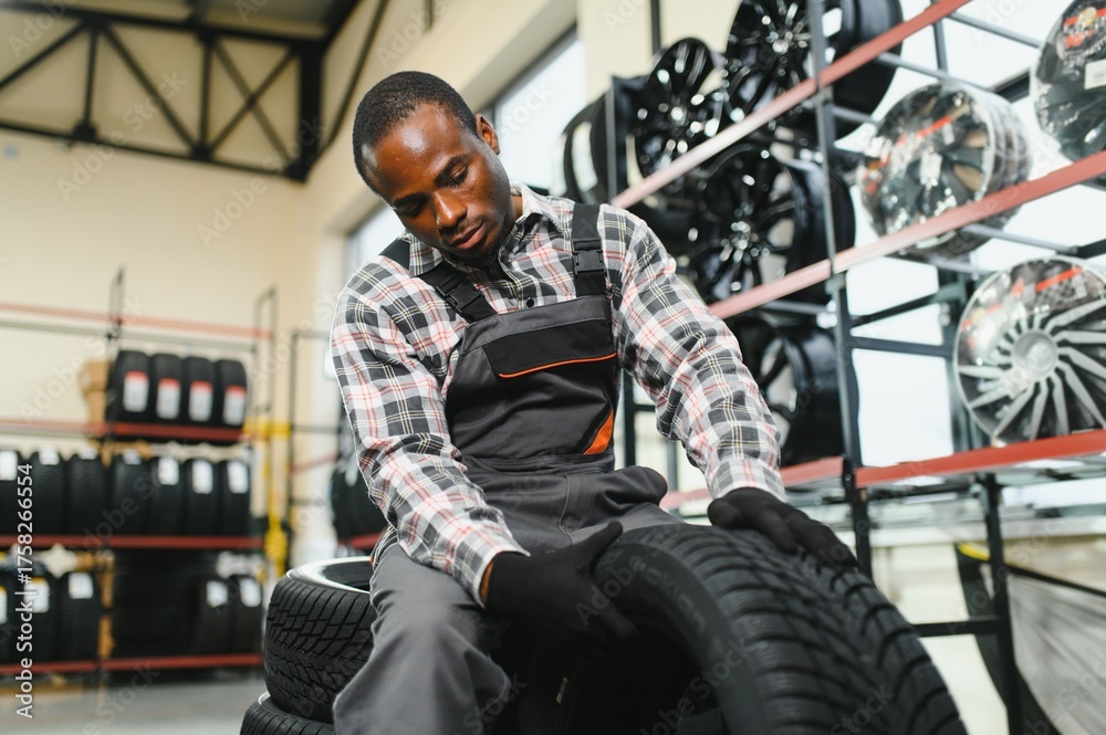 Portrait of African american warehouse worker standing by the pile of new car tires