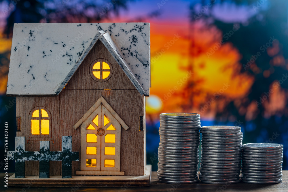 Wooden house toy model and stack of coins against the backdrop of nature at night. Concept of planning to save money for purchase or construction of a home, mortgage and real estate investment