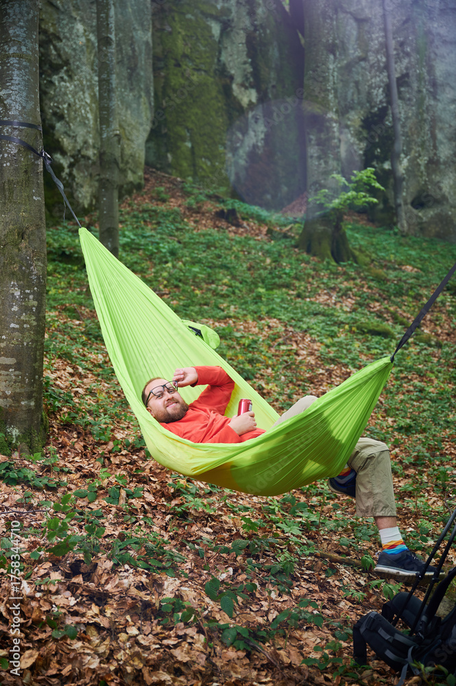 Person relaxing in bright green hammock tied between two trees in lush, green forest near rocks. Man tourist holds drink, enjoying peaceful moment surrounded by nature. Backpack and gear rest nearby.