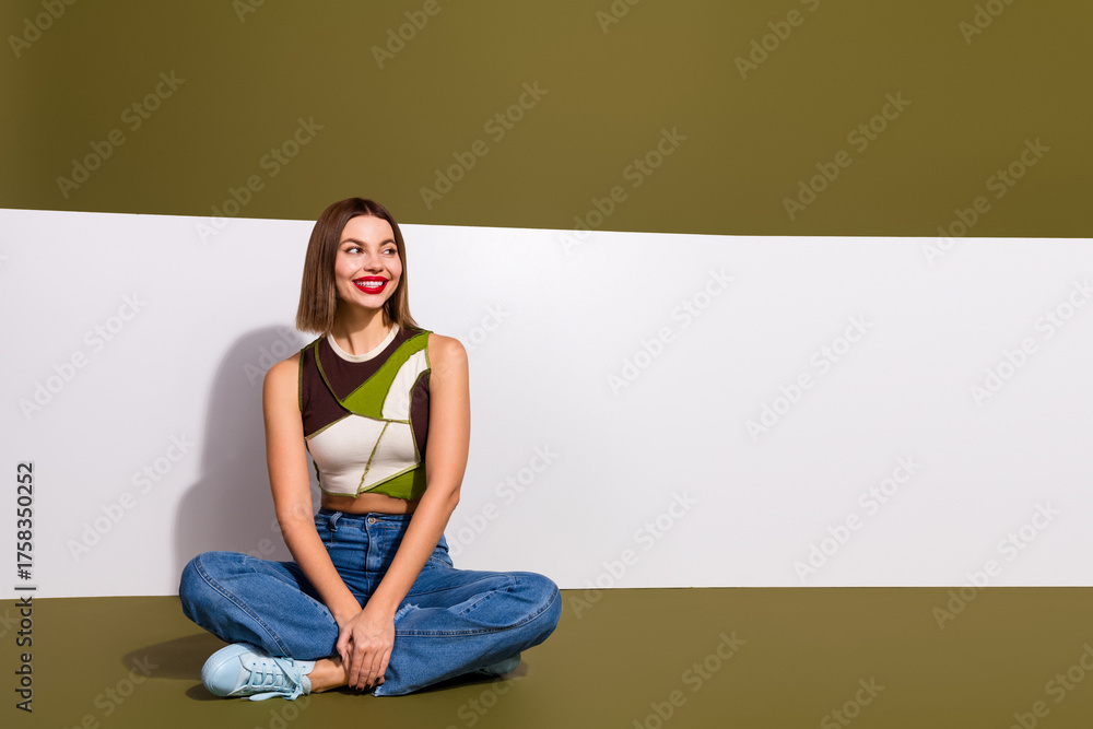 Young woman sitting relaxed on colorful background, showcasing casual style and modern fashion trends