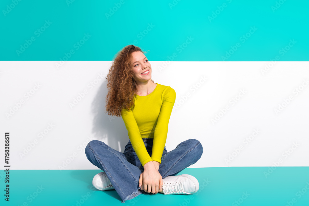 Smiling young woman in casual outfit sitting against vibrant turquoise and white background conveying cheerful and trendy atmosphere