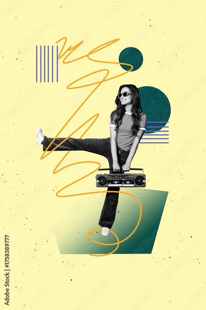 Template sketch image composite collage of young woman smile dance hand hold boombox music entertainment clubber night rest occasion