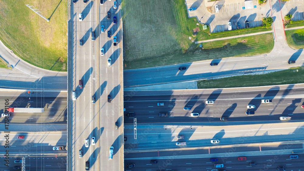 90-degree aerial of Lewisville, Texas multilane highway intersection with overpass, dense traffic flow, surrounding flat-roof buildings equipped with industrial HVAC units, service access roads
