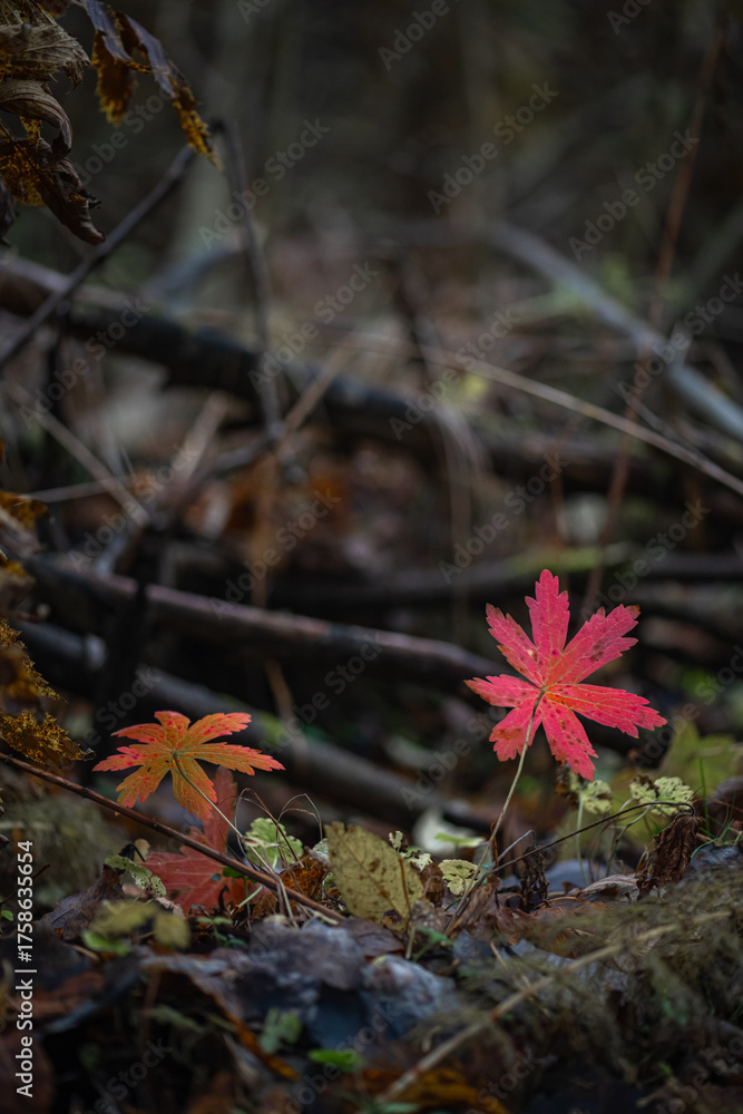 Autumn forest plants with watercolor bokeh. Bright reddish leaves in the forest