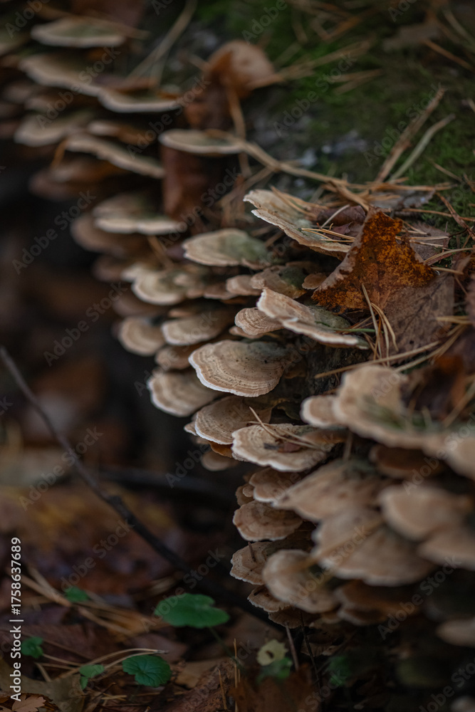 Close-up of autumn forest mushrooms. Warm seasonal colors and artistic blur