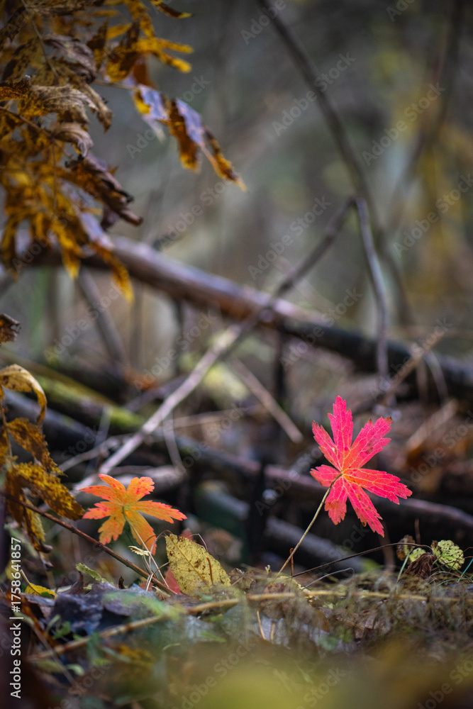Autumn forest plants with watercolor bokeh. Bright reddish leaves in the forest