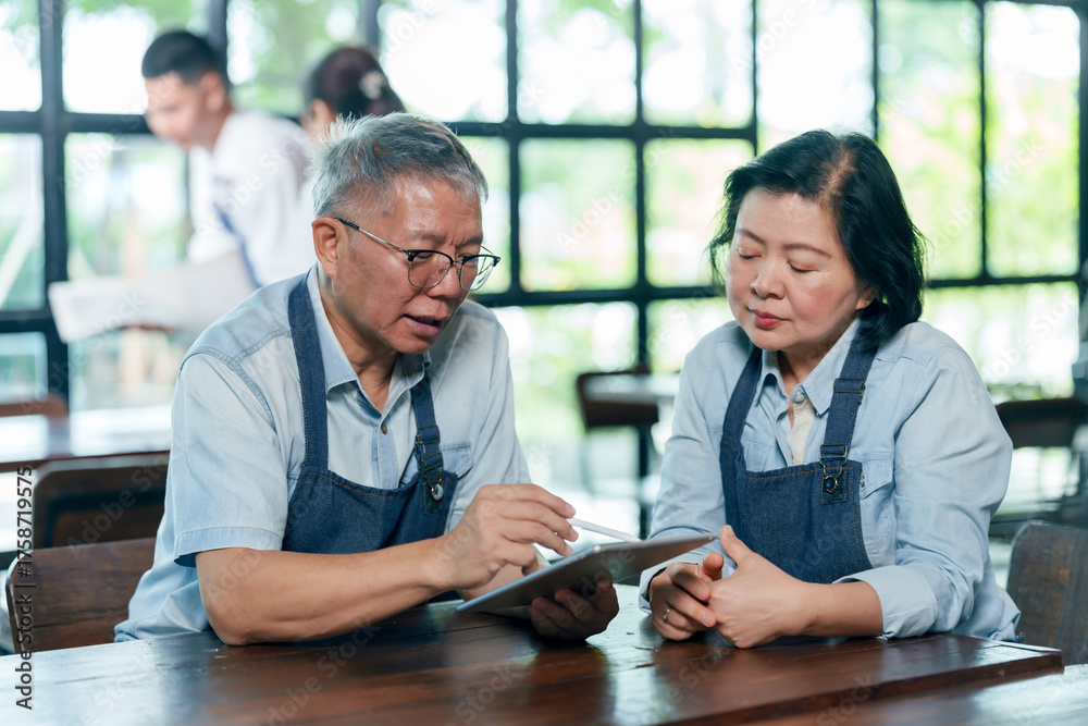 Elderly asian couple wearing aprons sitting in cafe discussing restaurant management and financial planning using tablet teamwork collaboration small business partnership communication cooperation