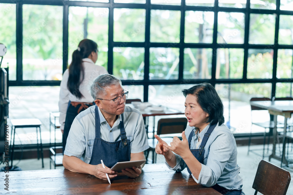 Elderly asian couple in aprons sitting at wooden table discussing cafe sales report using tablet teamwork collaboration communication small business management cooperation partnership restaurant