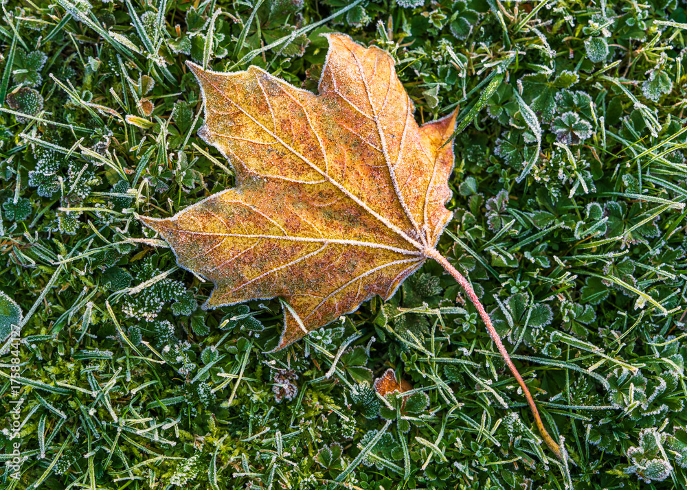 Frozen yellow maple leaf on dewy green grass during first autumn frost. Macro view showing the transition from fall to winter in natural setting.