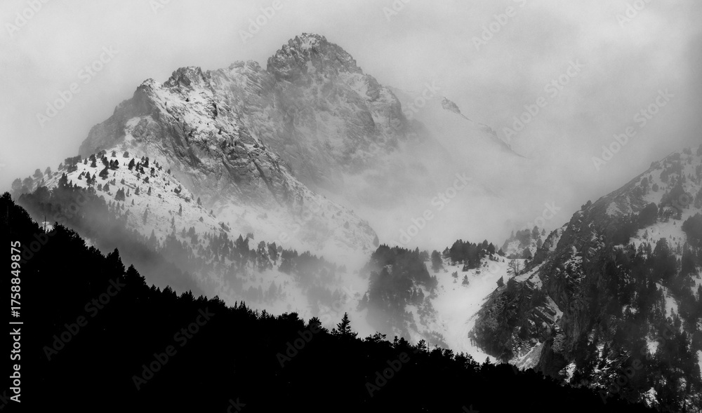 Black and white winter landscape of snow covered mountains and sky with clouds