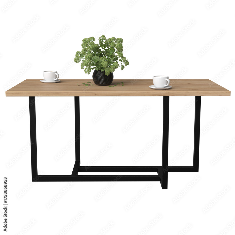 Contemporary dining table in loft style with black metal frame and wooden tabletop. Minimalist kitchen or dining room furniture on white background.