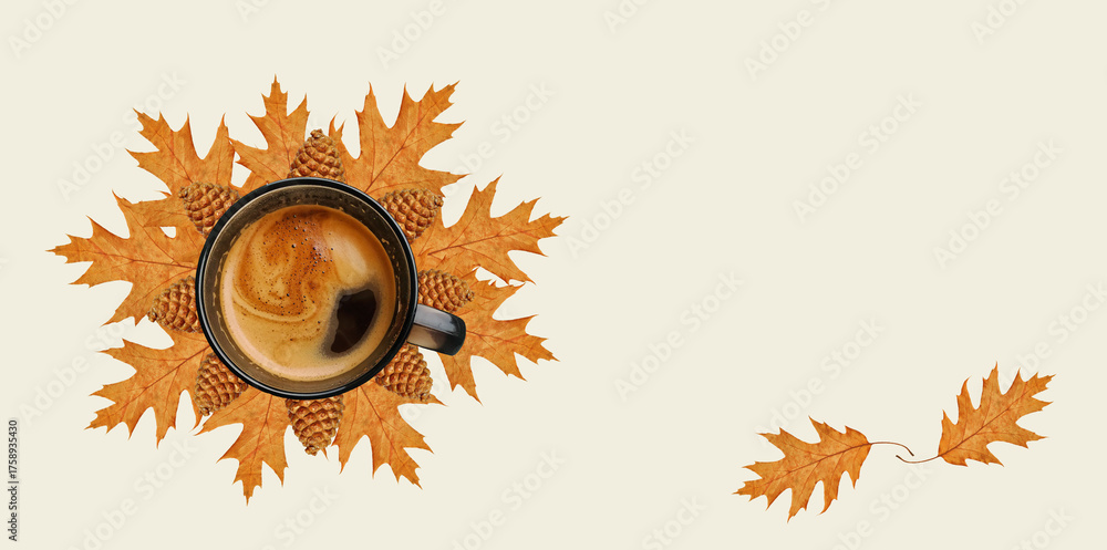 National Coffee Day concept. Gourmet coffee. Fall coffee wallpaper. Coffee cup from above, coffee with foam, dark glass cup, dried oak leaves as coaster. Modern design coffee poster. Minimal image