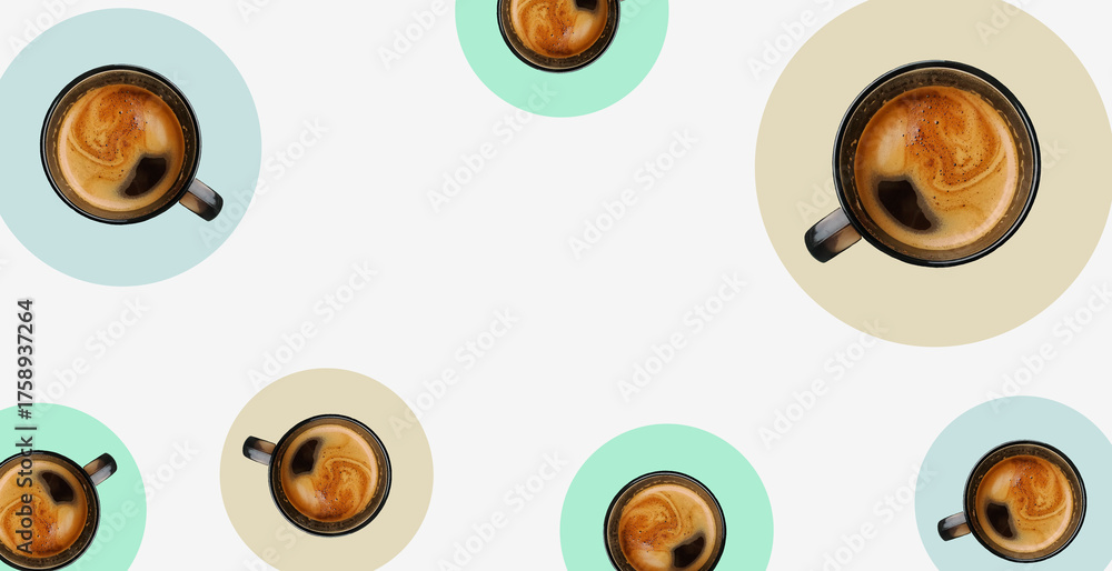 Modern minimal design coffee wallpaper. Coffee cup from above, coffee with foam, dark glass cup, coffee sip. Colorful circles. Coffee drink patterns, pastel colors. National Gourmet Coffee Day concept