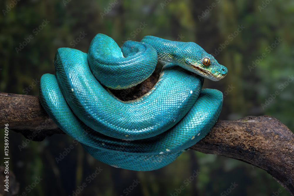 A stunning blue morph of the green tree python (Morelia viridis) resting on a branch. This rare color variant is known for its vibrant turquoise scales and striking appearance.