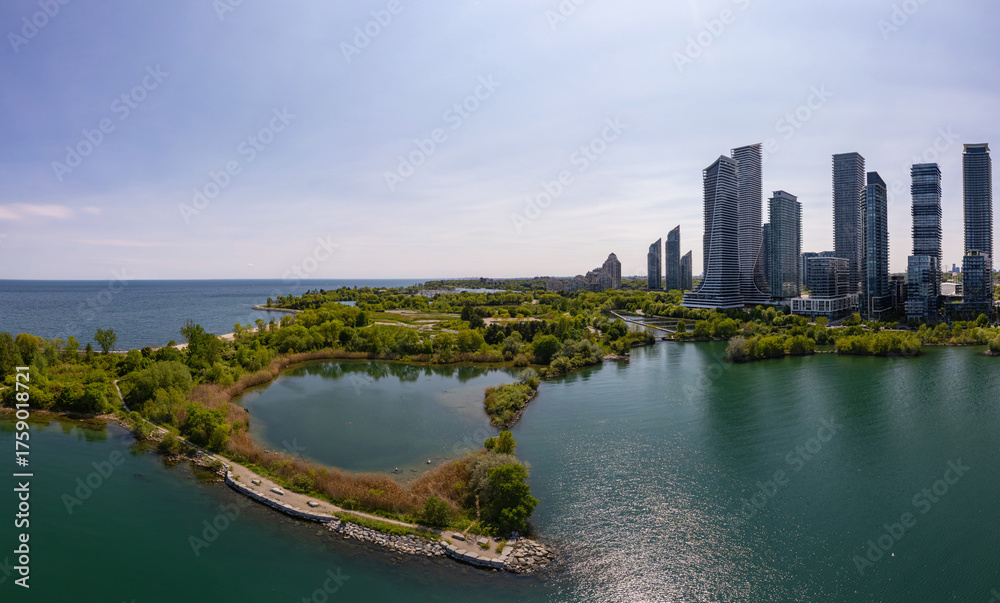 Aerial view of Humber Bay Shores, Etobicoke near Toronto area is chic waterfront gem. Epic cityscape condos buildings, vibrant green park trails near lakefront scenic escapes and modern living. Mimico