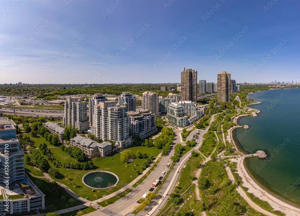 Aerial view of Mimico’s waterfront epic cityscape. Summer vibes at Marine Parade and Lake Shore West. Chic condos with stunning lake views, vibrant park, and urban living in Etobicoke near Toronto.