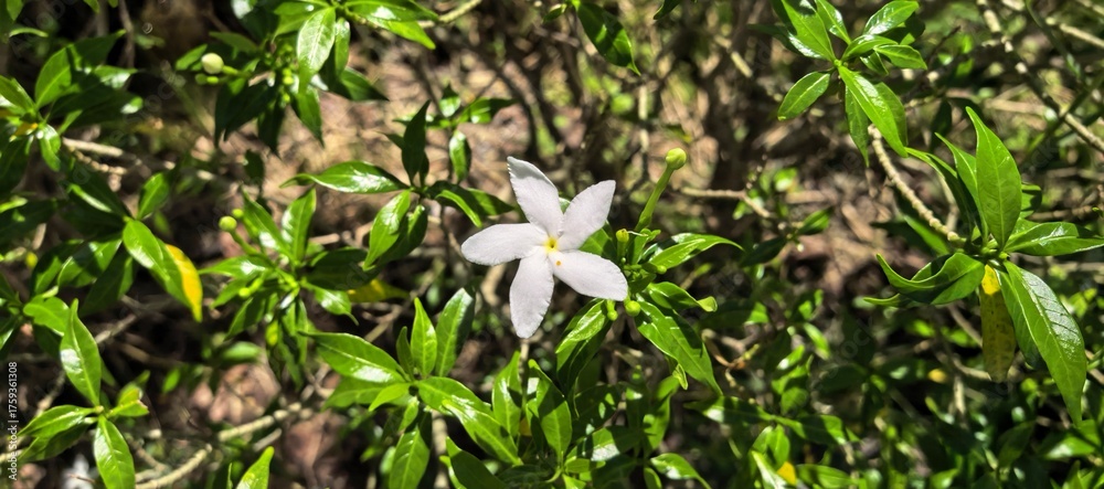 Beautiful white flower with green leaves in natural sunlight